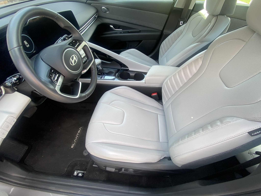 En su interior, el Elantra desde la primera vista te da una fantástica impresión con su moderna cabina y materiales de alta calidad. A mi en lo personal, me encanta la forma y el tamaño del volante, que cuenta con dos pequeños radios planos en forma de cuchilla a cada lado donde puedes apoyar las manos y si quie ajustar la posición de conducción a su estilo y medida.