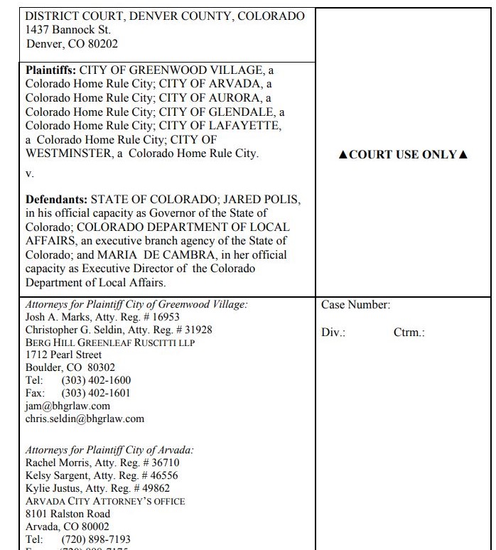La demanda fue presentada el lunes en el Tribunal de Distrito de Denver por las ciudades de Arvada, Aurora, Glendale, Greenwood Village, Lafayette y Westminster.